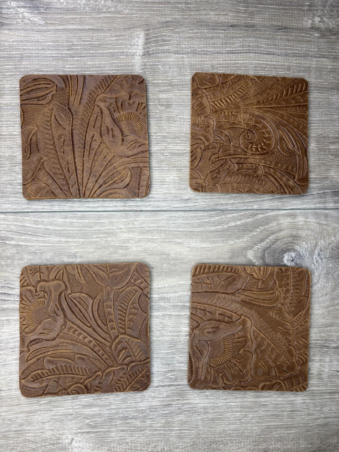 4 pack of coasters with brown stamped leather attached to cork bottom. 4 inch square in size.