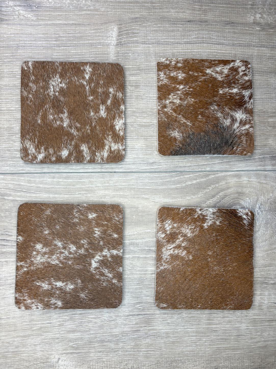 4 pack of coasters with brown and white hair on hide attached to cork bottom. 4 inch square in size.