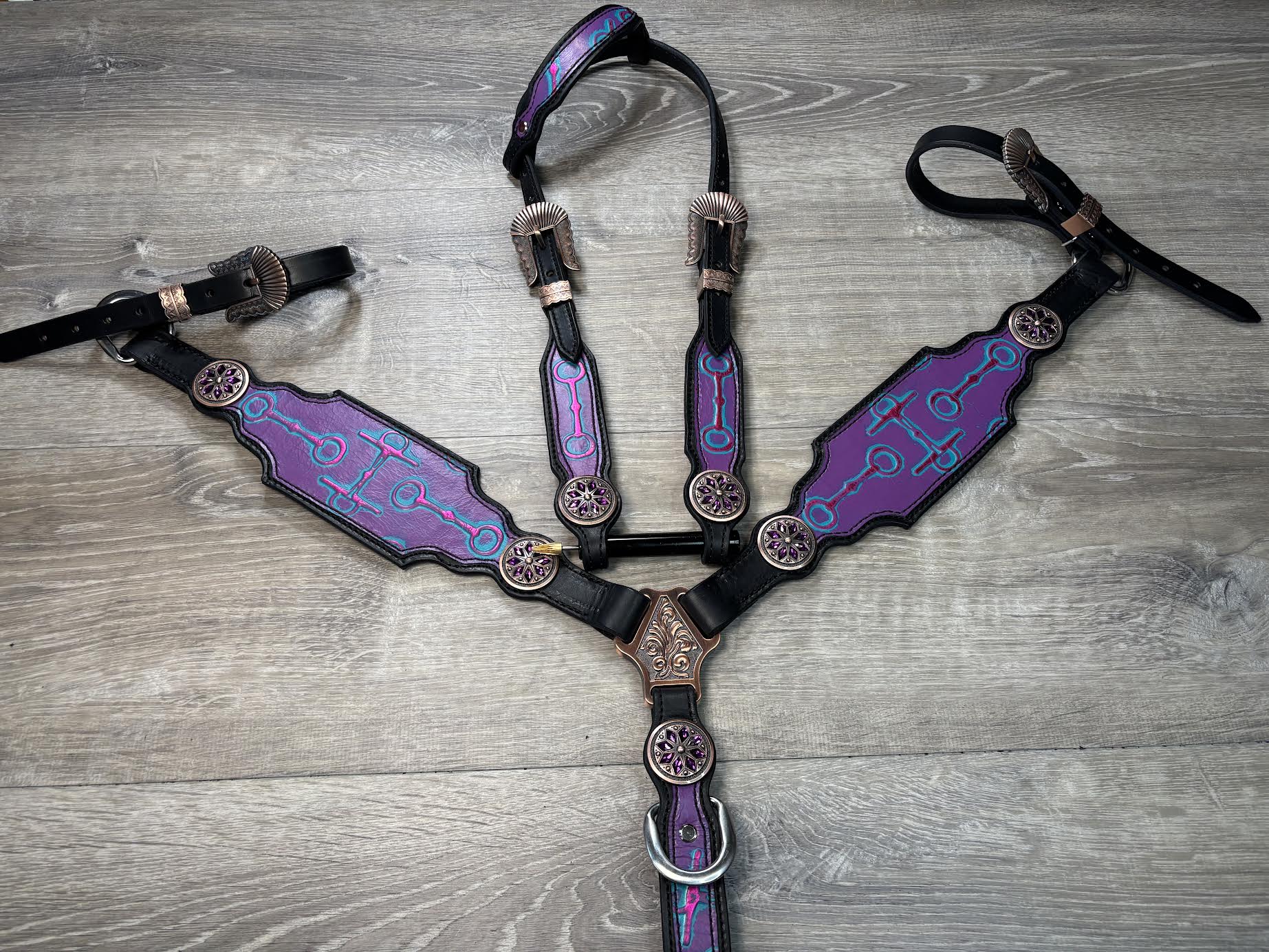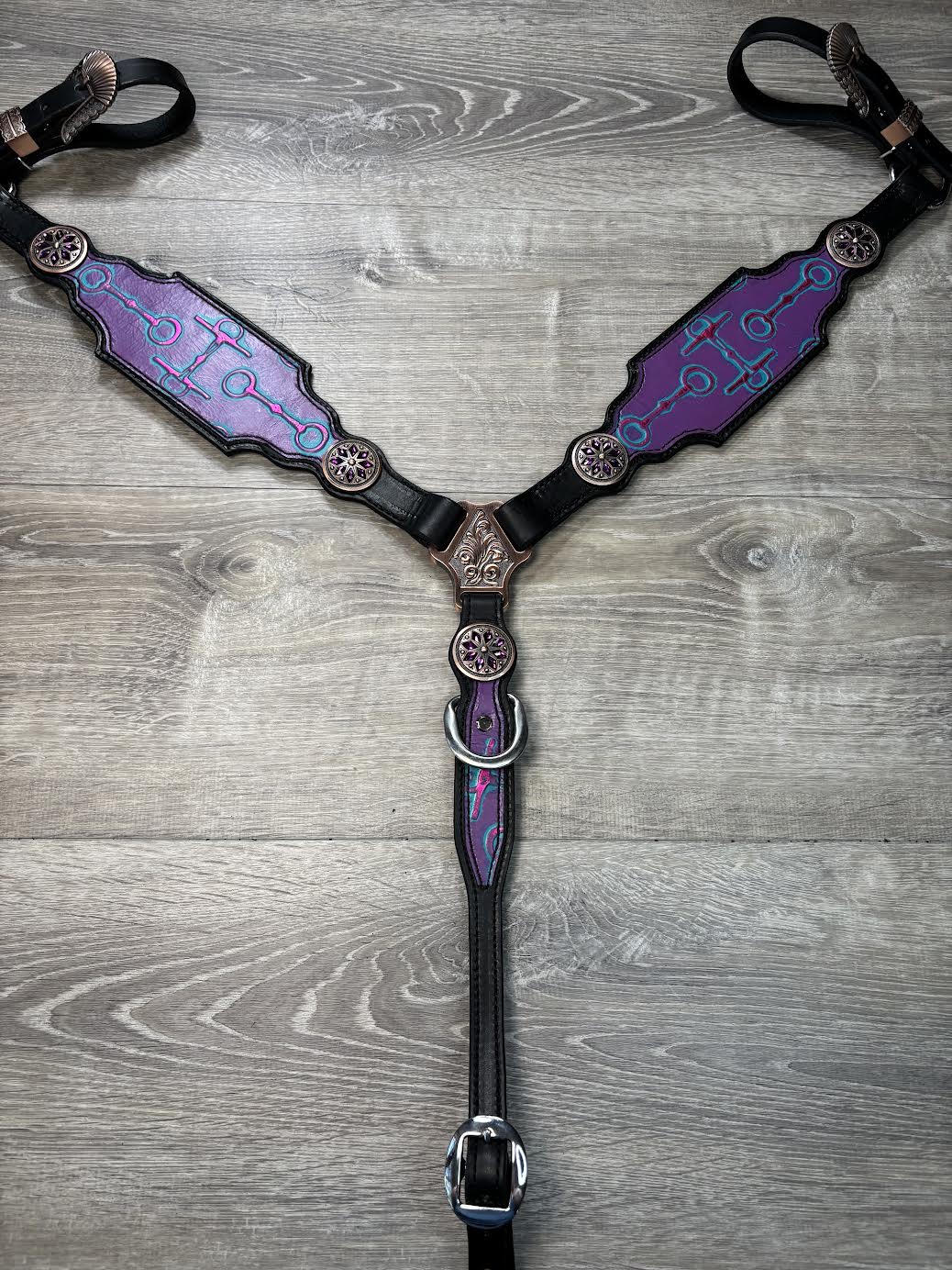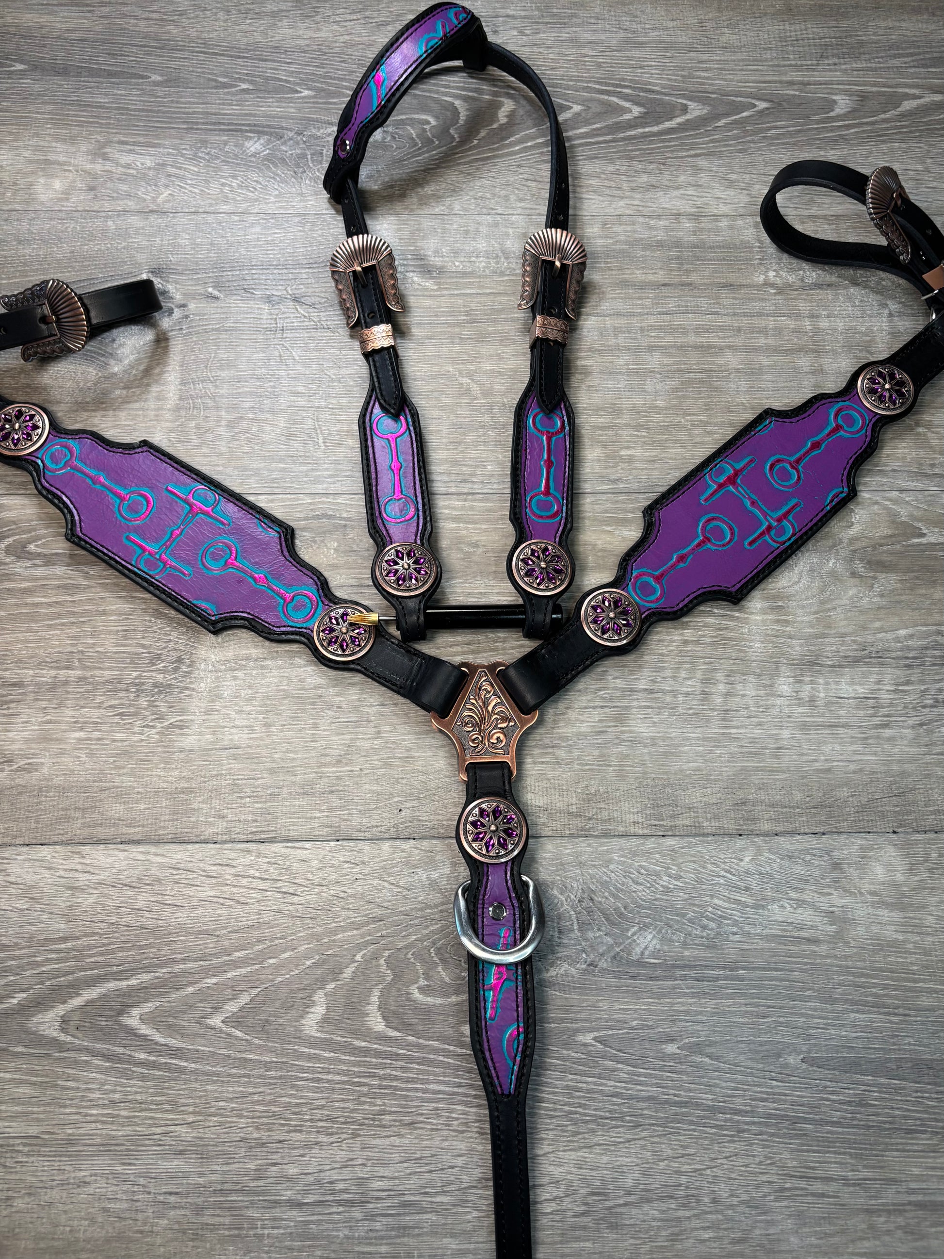 Bits headstall and breastcollar set. Horse size with purple flower conchos and a stainless steel buckle on the center strap.