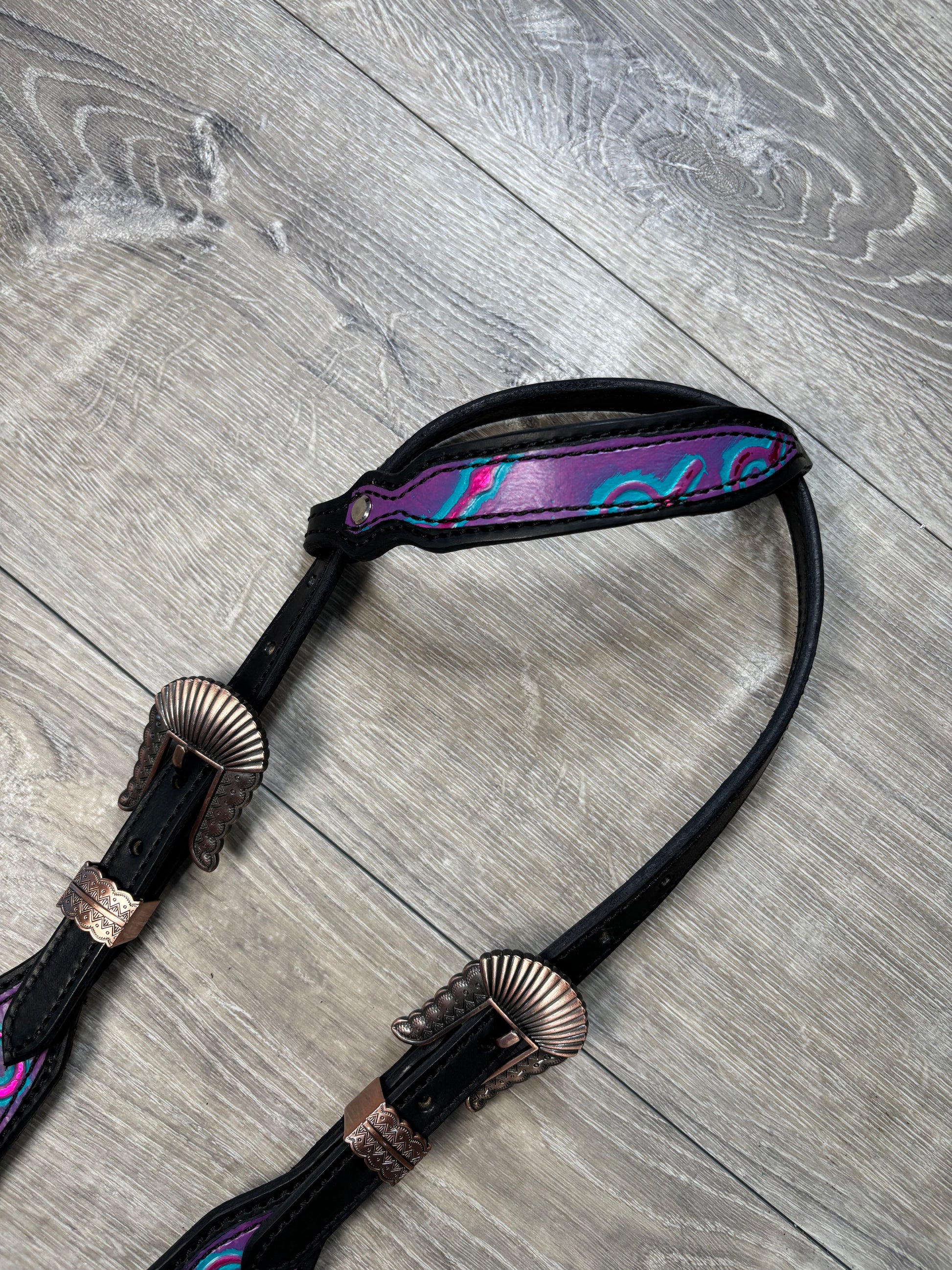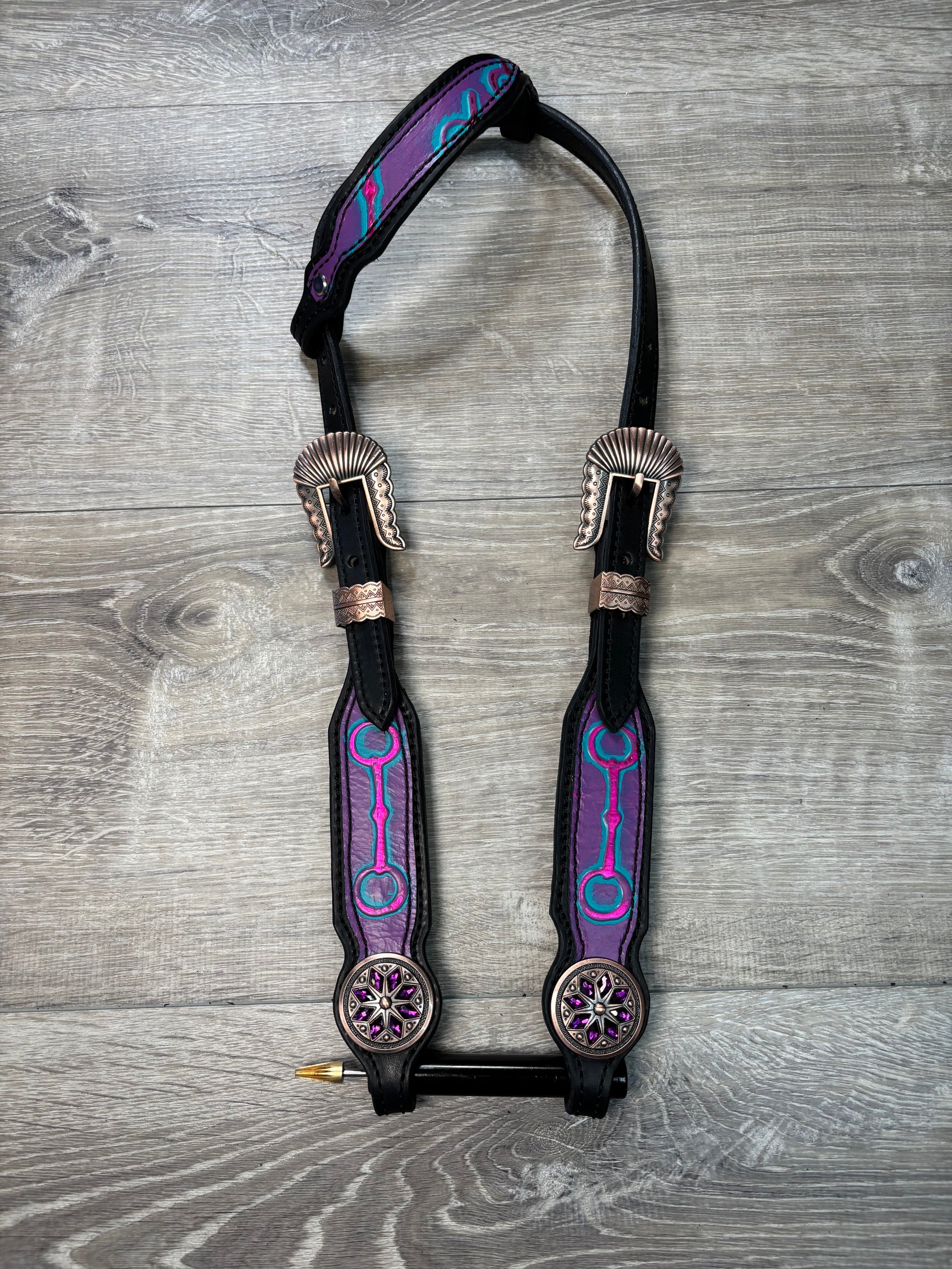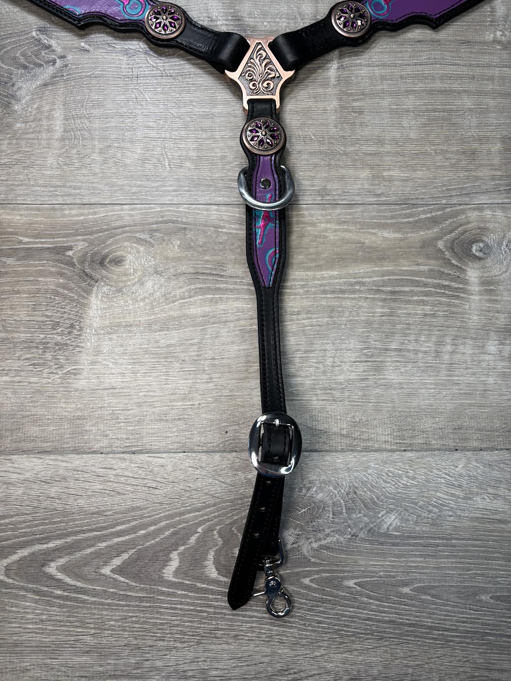 Bits headstall and breastcollar set. Horse size with purple flower conchos and a stainless steel buckle on the center strap.
