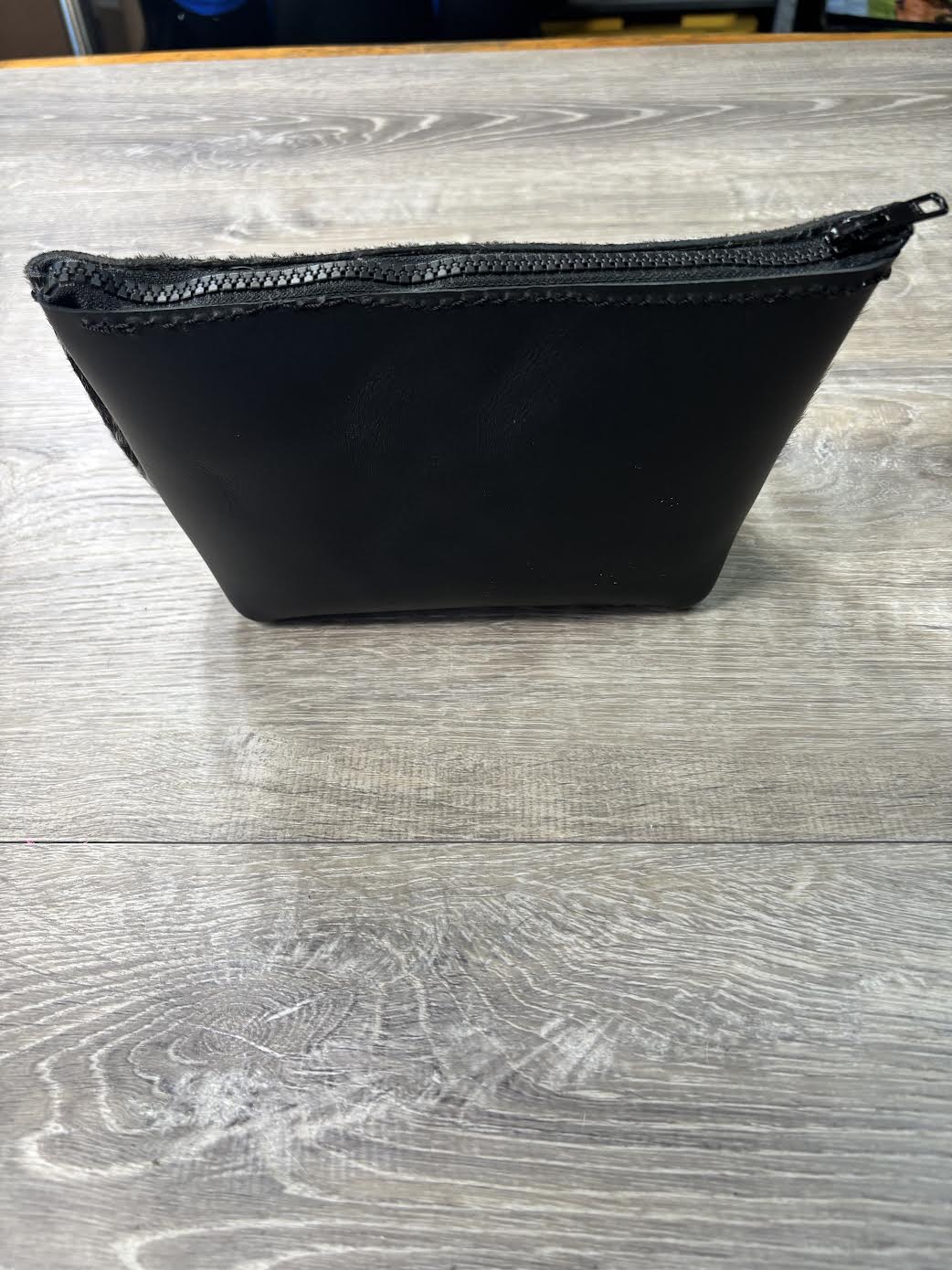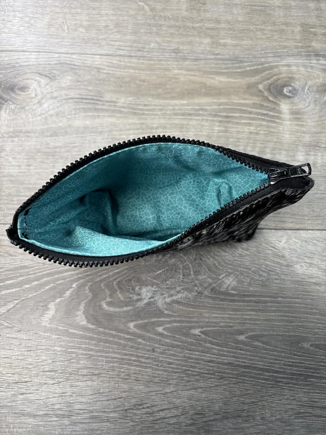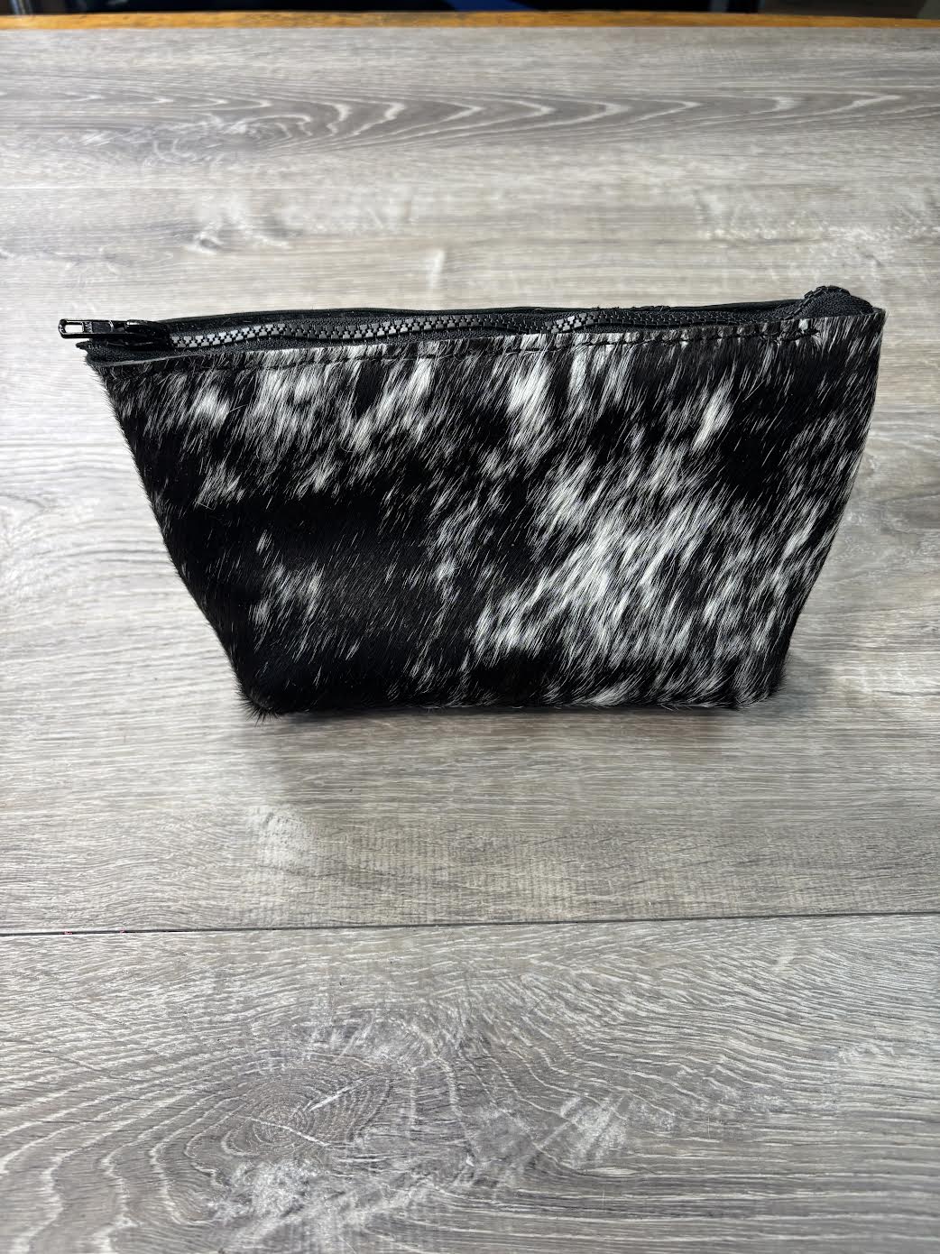 Black and white hair on hide, black leather back, zipper closure, and blue cotton liner. 9.5"x5"x3"