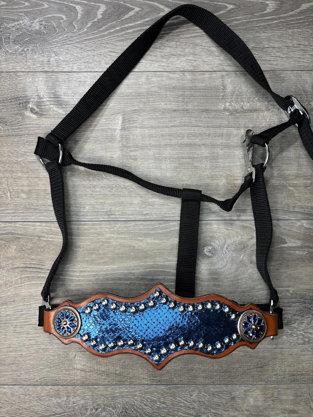 Bronc leather halter with blue snake overlay, copper and blue conchos and silver spots. Your purchase includes a black nylon halter that you can easily change out with two phillips head screws.