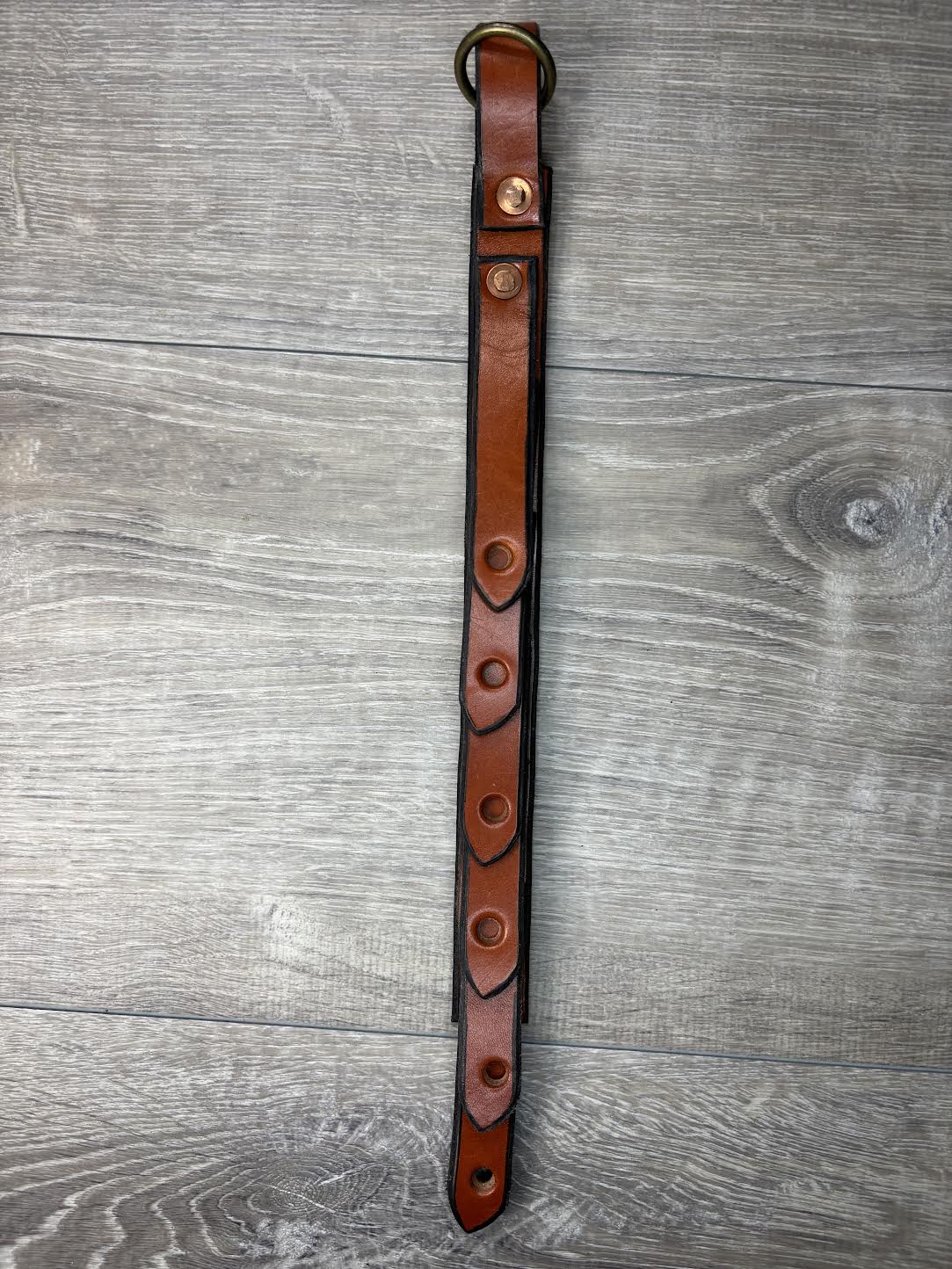 Saddle tan leather cinch hanger for hanging 6 cinches up in your trailer or tack room. Each cinch can individually be added or removed. 15" X 1"