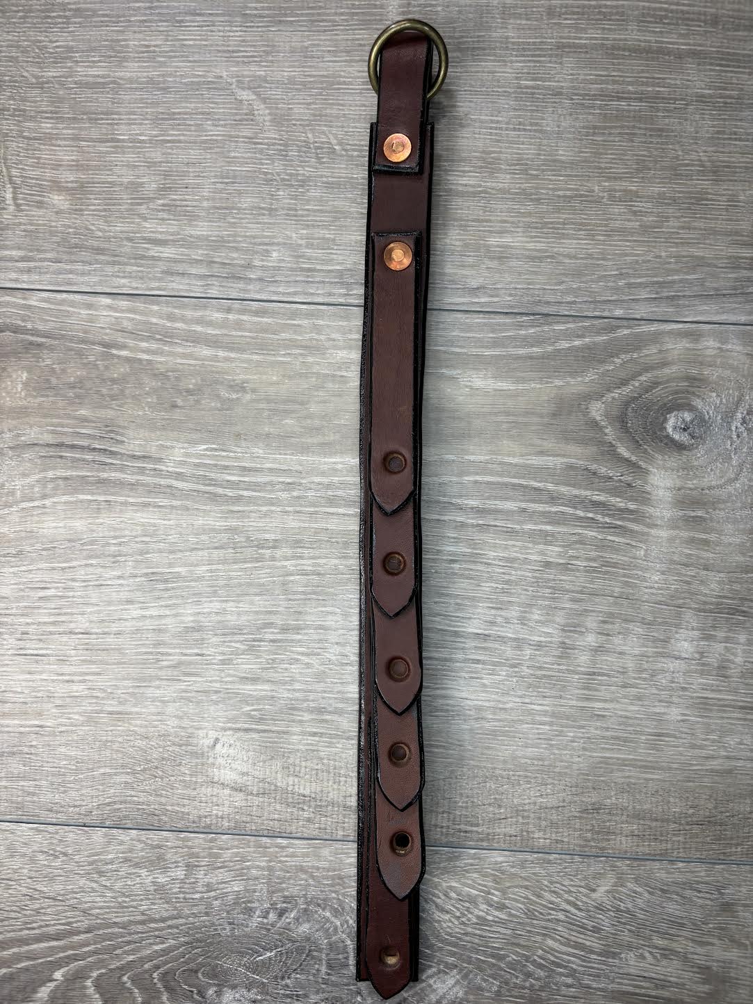 Brown leather cinch hanger for hanging 6 cinches up in your trailer or tack room. Each cinch can individually be added or removed. 15" X 1"