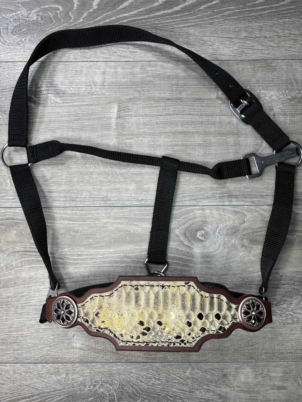 Leather bronc halter covered with a golden snake leather and copper and black conchos. Your purchase includes a black nylon halter that you can easily change out with two phillips head screws.