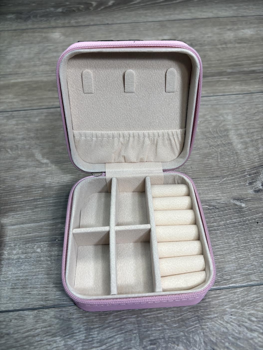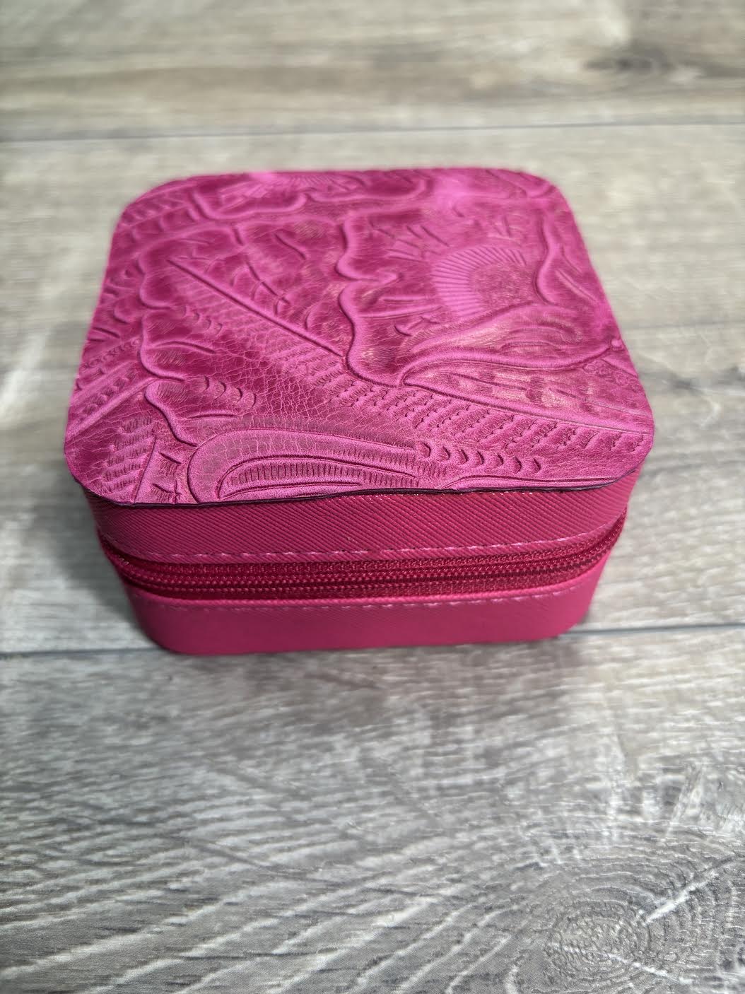 3.75" x 3.75" x 2" jewelry box with transition hide top. It has 3 hooks for necklaces, 6 ring slots, and a removable partition.