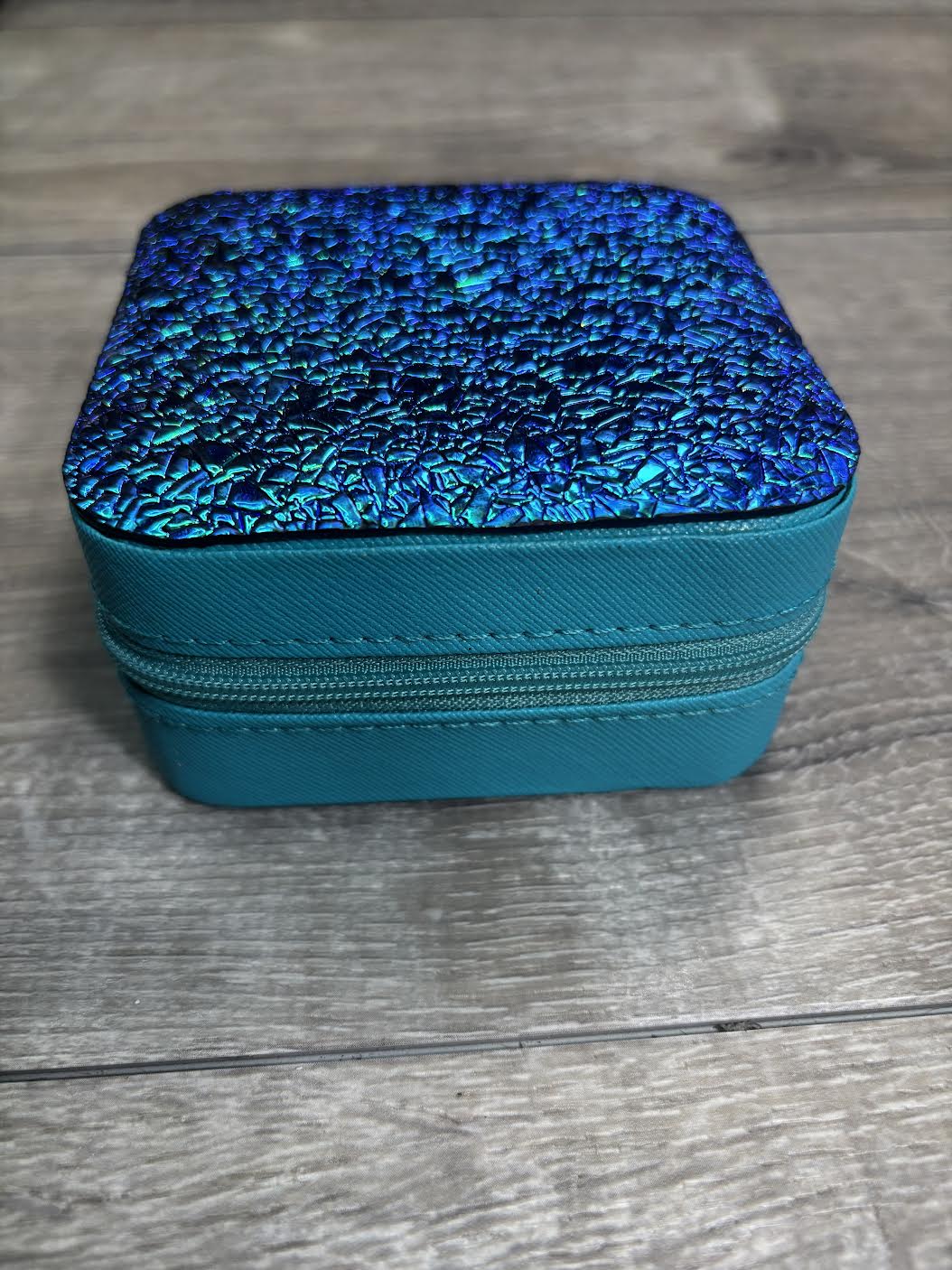 3.75" x 3.75" x 2" jewelry box with transition hide top. It has 3 hooks for necklaces, 6 ring slots, and a removable partition.