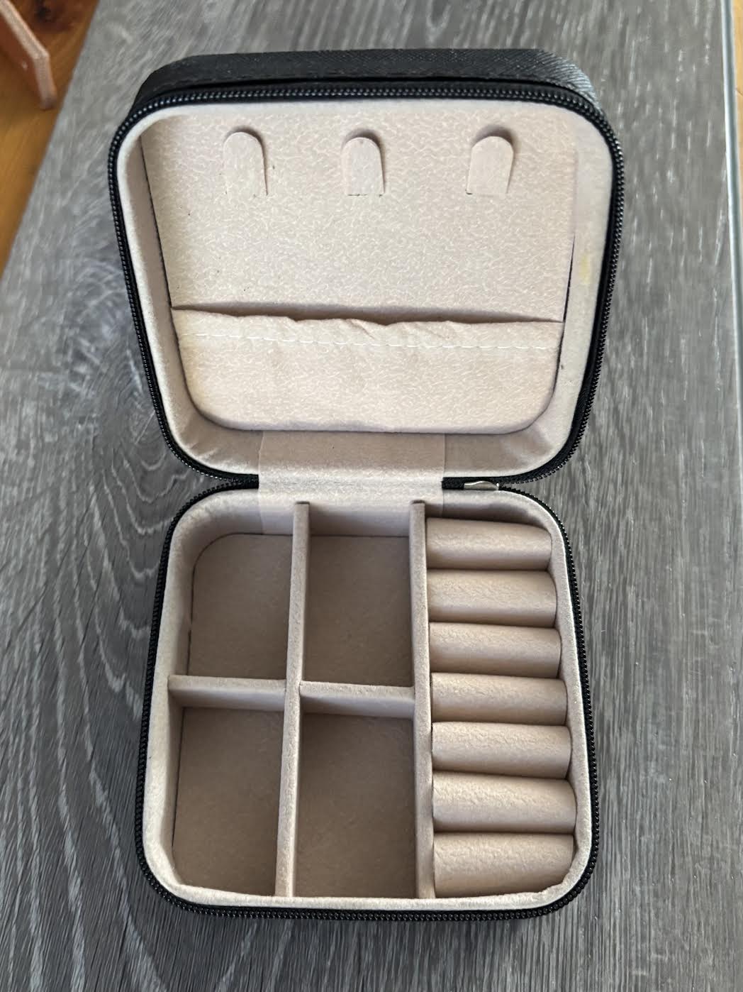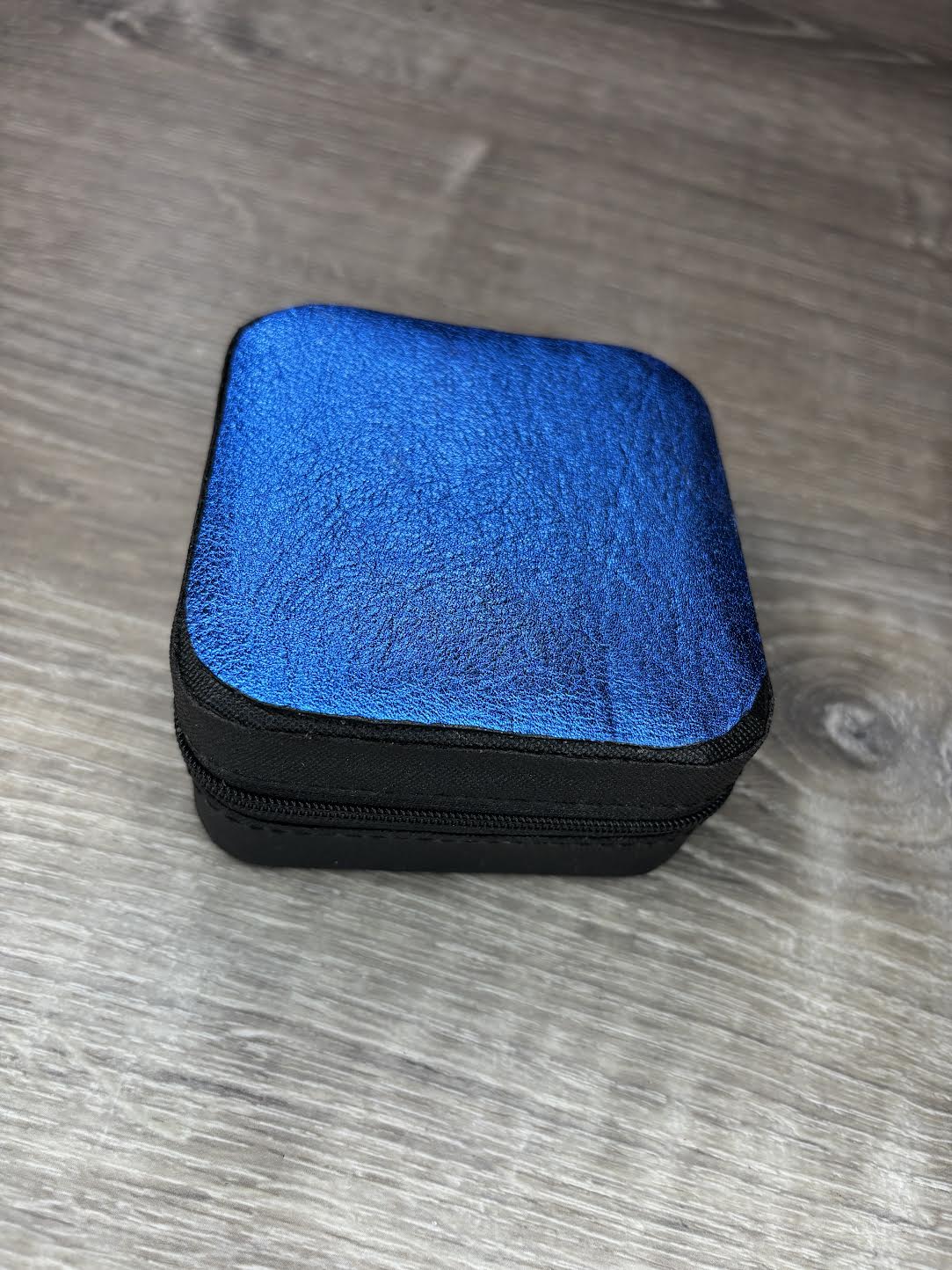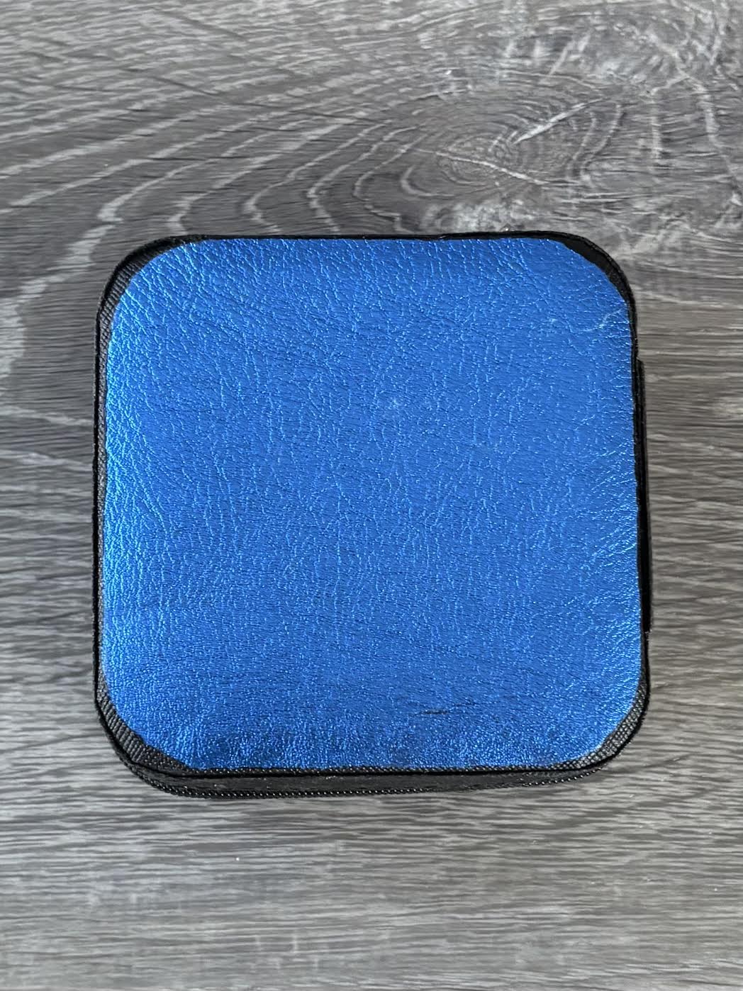 3.75" x 3.75" x 2" jewelry box with metallic blue top. It has 3 hooks for necklaces, 6 ring slots, and a removable partition.