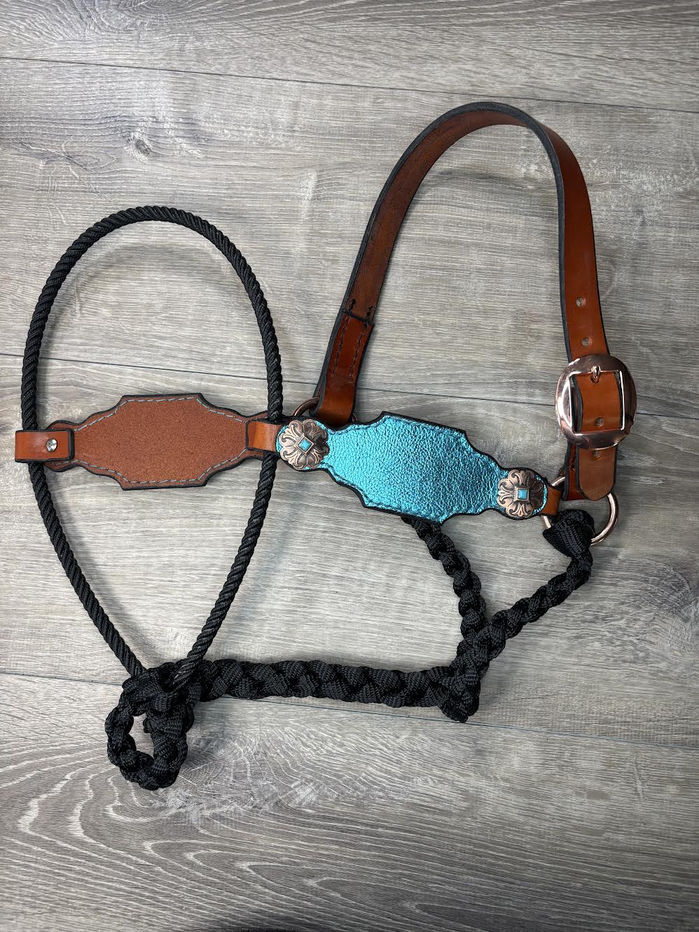 Lariat hybrid halter with turquoise pebble overlay, copper with turquoise stone conchos, lariat noseband, leather cheeks and crownpiece, and mule tape throatlatch, connecting strap and ring. Horse size.