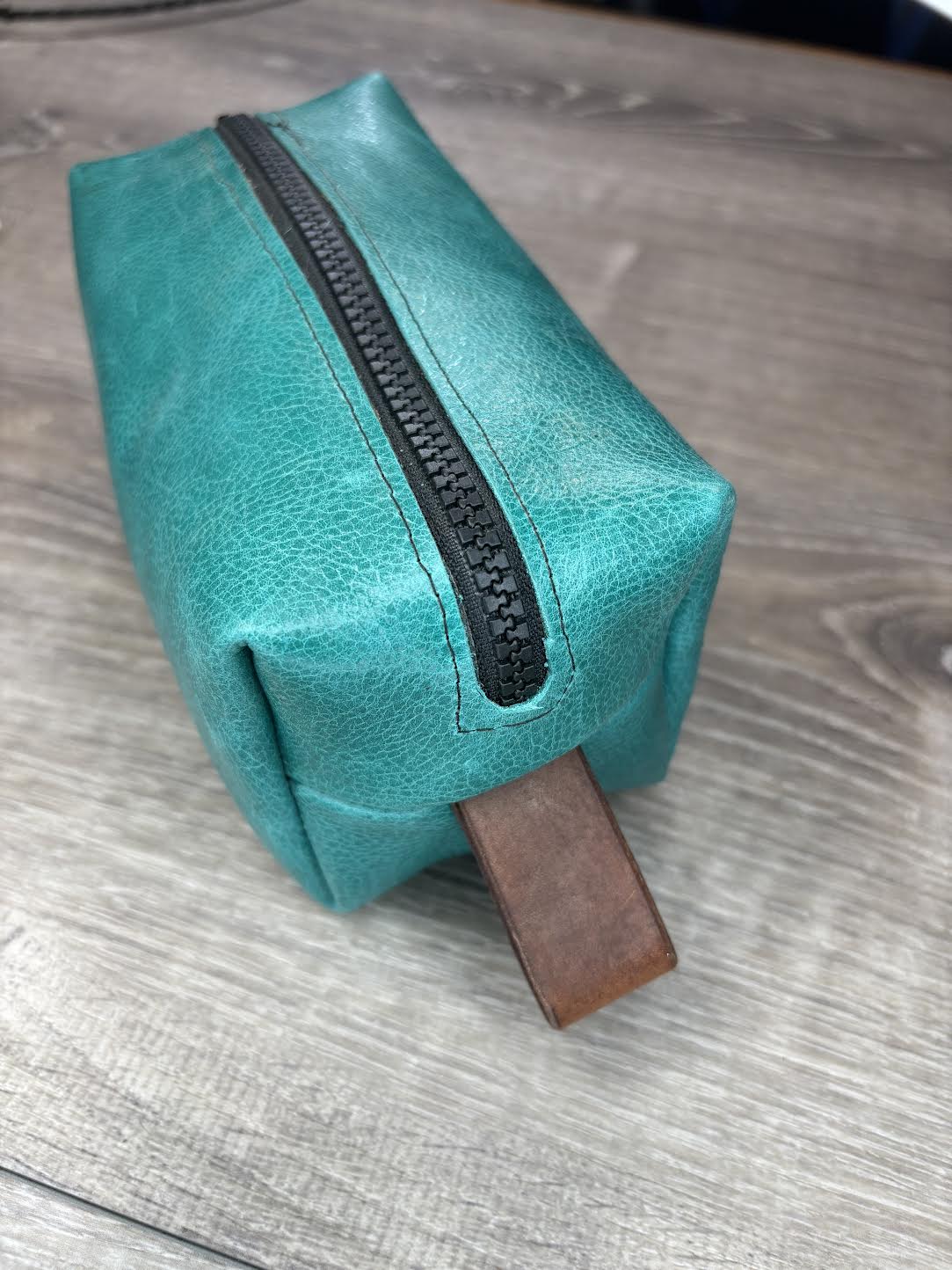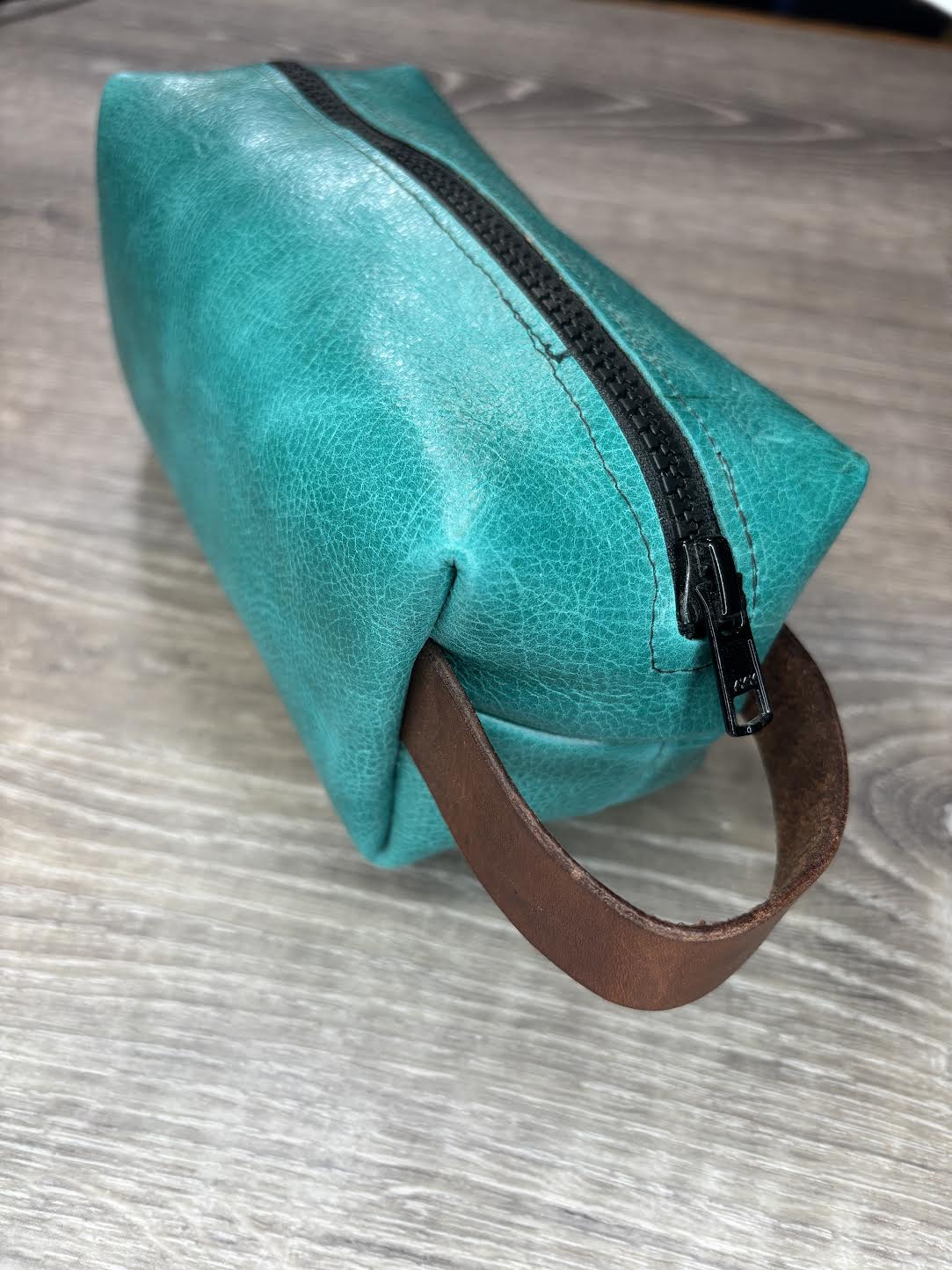 Mini Dopp bag useful for toiletries and small supplies. Comes with zipper for easy access and a handle one one side and a small loop on the other side. The size is 7" x 3" x 3".