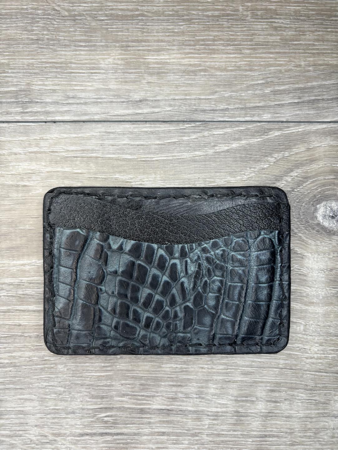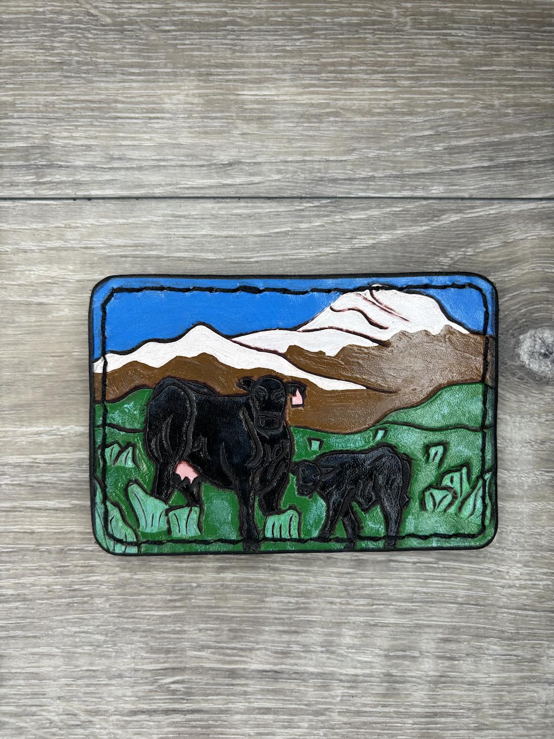 Wallet with card pockets to hold the essentials. Use this to keep your important cards and cash handy with a minimal design case. Made from genuine leather and hand tooled and painted with a black cow and calf design. 4.25" X 3"