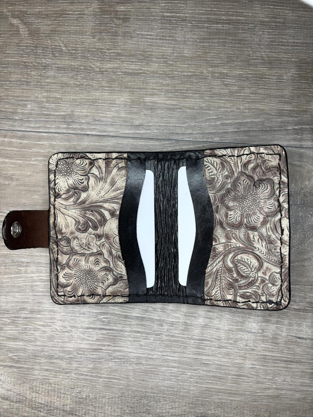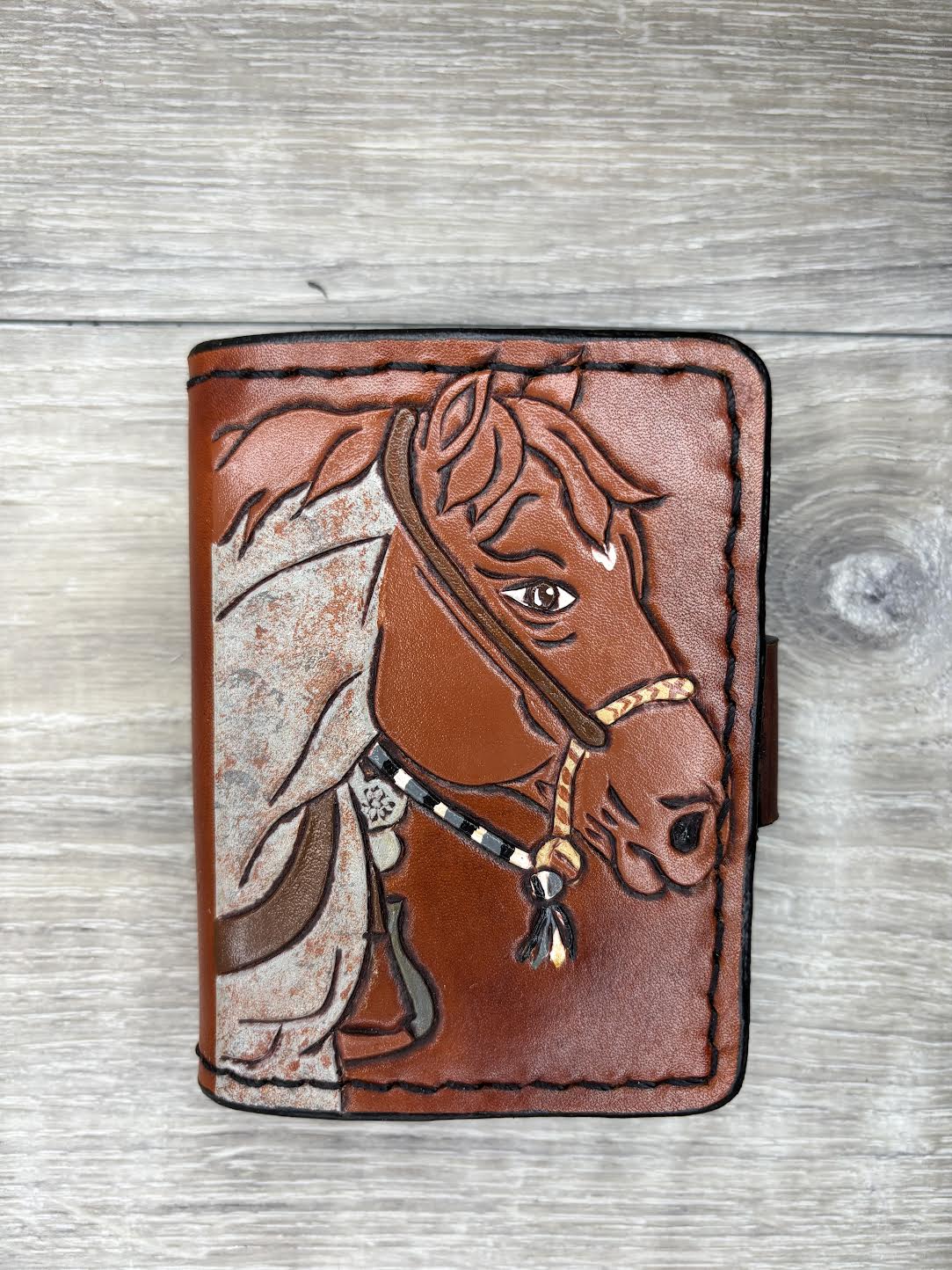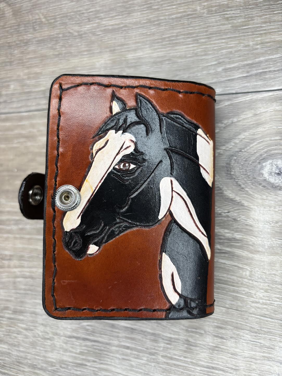 Snap close double wallet with 4 card pockets to hold the essentials. Use this to keep your important cards and cash handy with a minimal design case. Made from genuine leather and hand tooled and painted with a red roan horse and a black and white paint horse design. 6.5"X4.25" unfolded and 3.25"X4.25"X1"