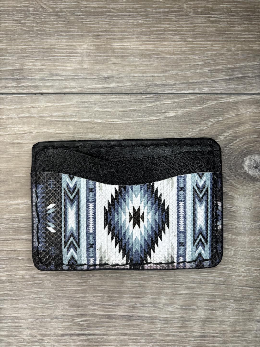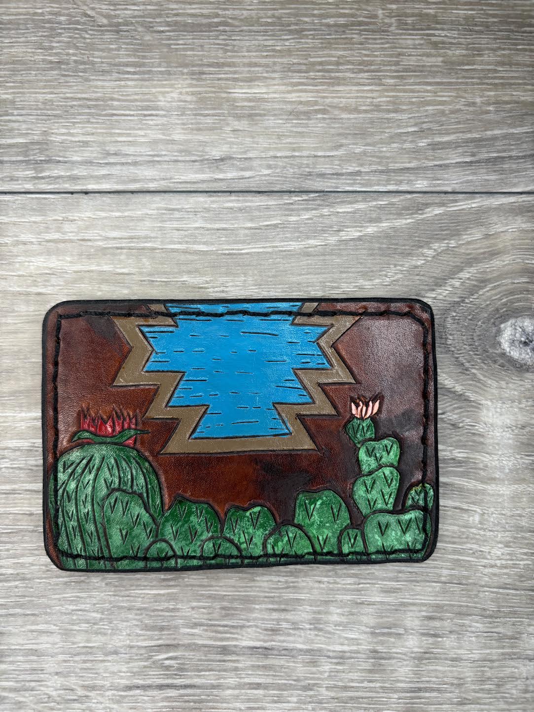 Wallet with card pockets to hold the essentials. Use this to keep your important cards and cash handy with a minimal design case. Made from genuine leather and hand tooled and painted with a cactus design. 4.25" X 3"