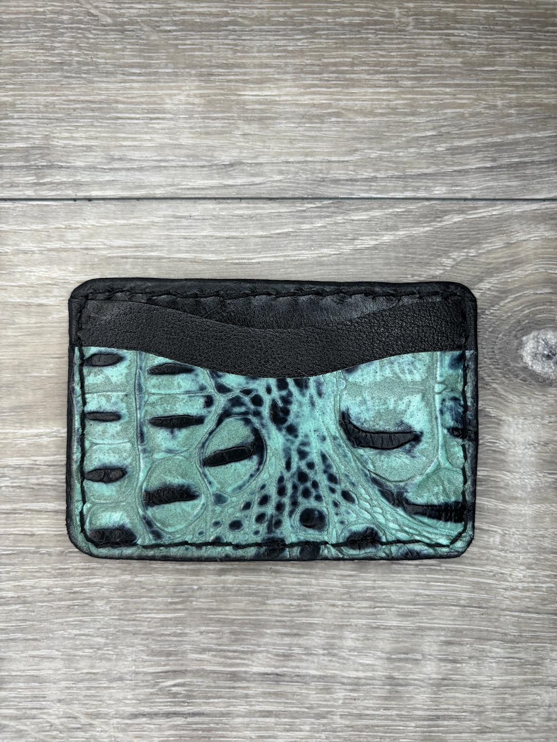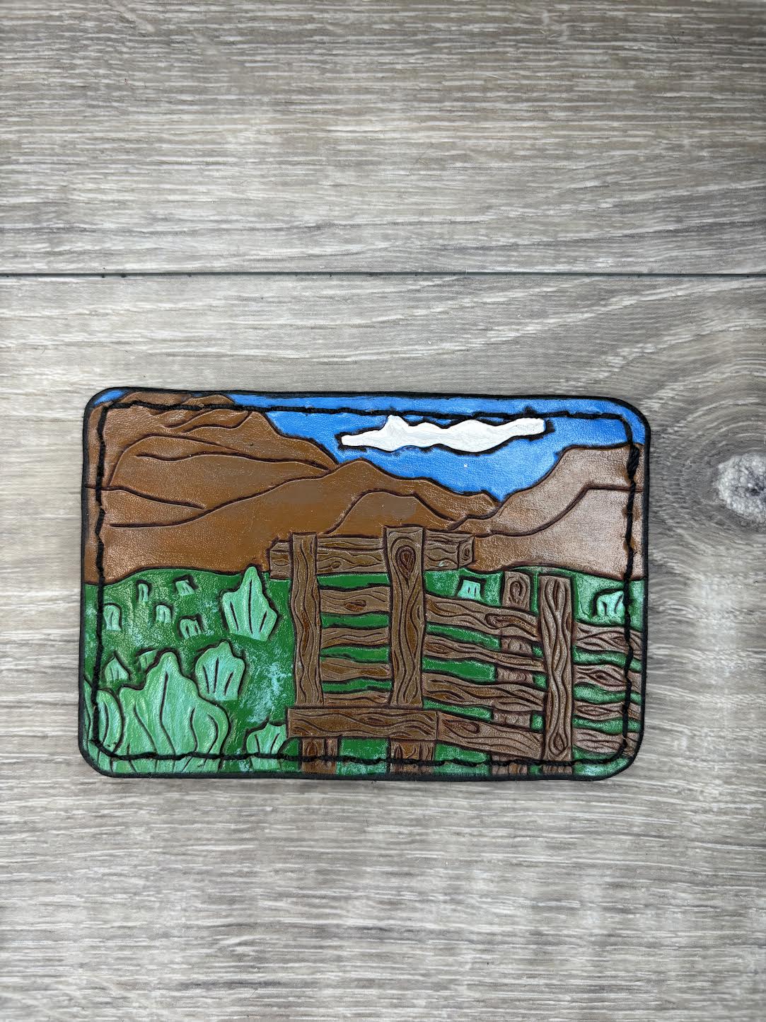 Wallet with card pockets to hold the essentials. Use this to keep your important cards and cash handy with a minimal design case. Made from genuine leather and hand tooled and painted with a wood fence design. 4.25" X 3"