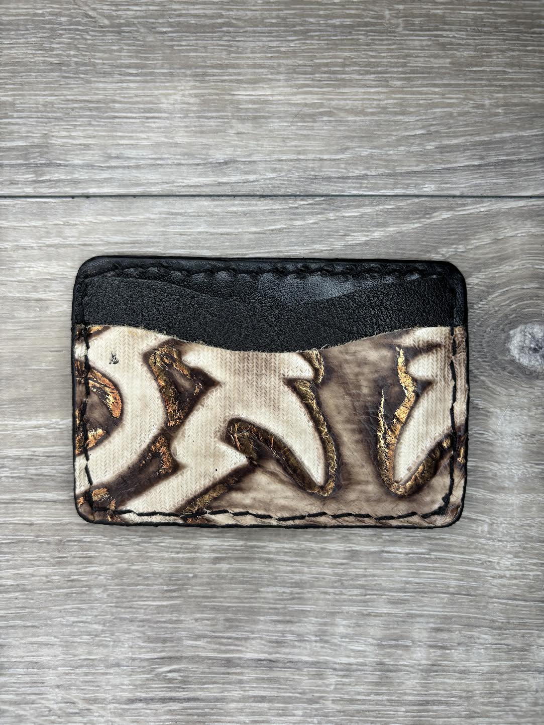 Wallet with card pockets to hold the essentials. Use this to keep your important cards and cash handy with a minimal design case. Made from genuine leather and hand tooled and painted with a palomino horse design. 4.25" X 3"