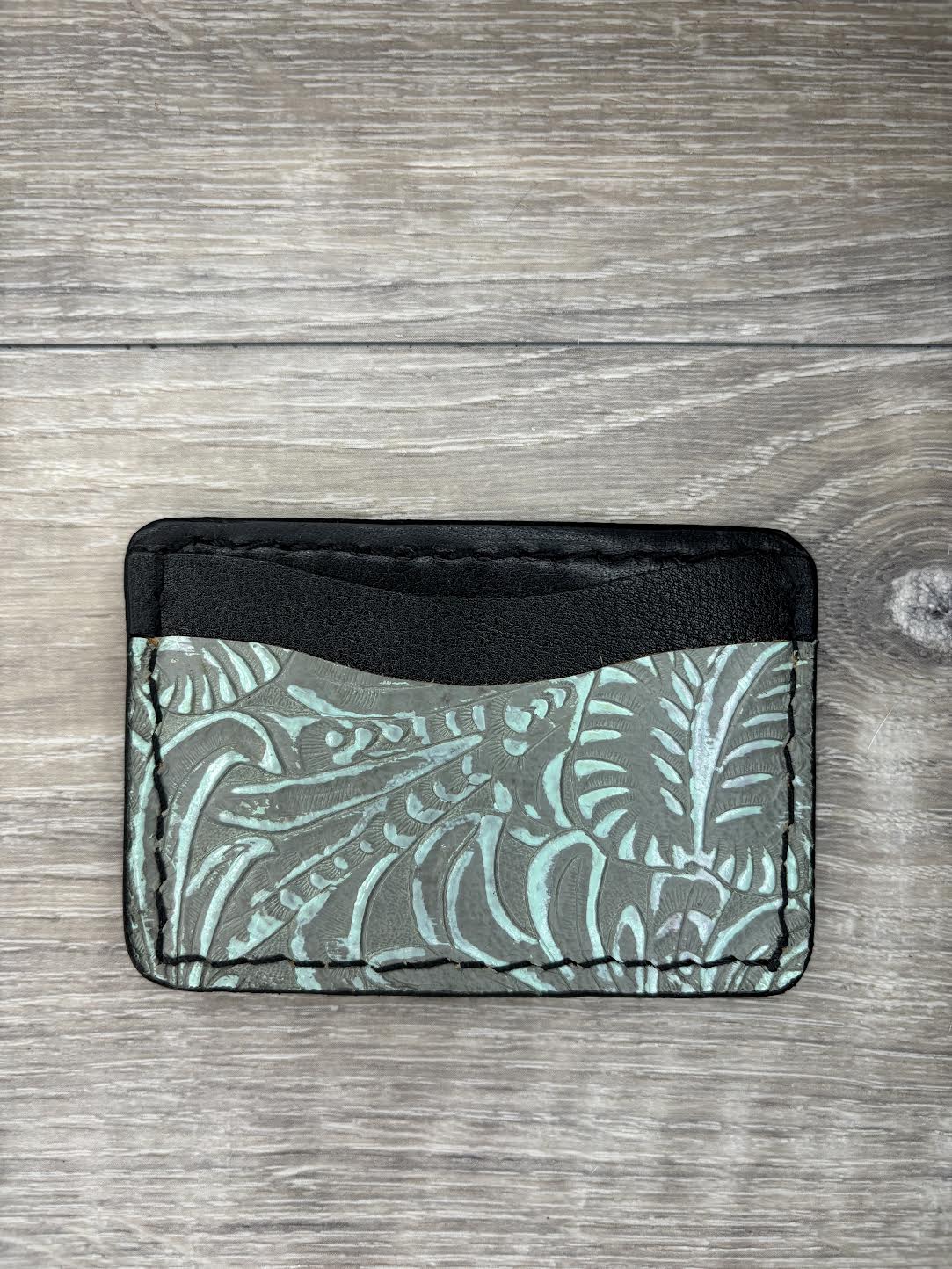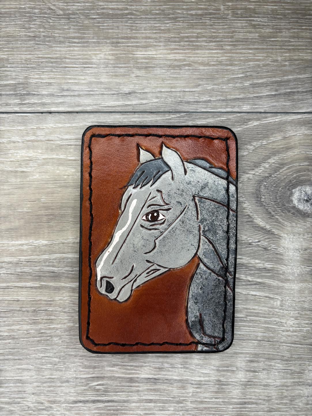 Wallet with card pockets to hold the essentials. Use this to keep your important cards and cash handy with a minimal design case. Made from genuine leather and hand tooled and painted with a gray horse design. 4.25" X 3"