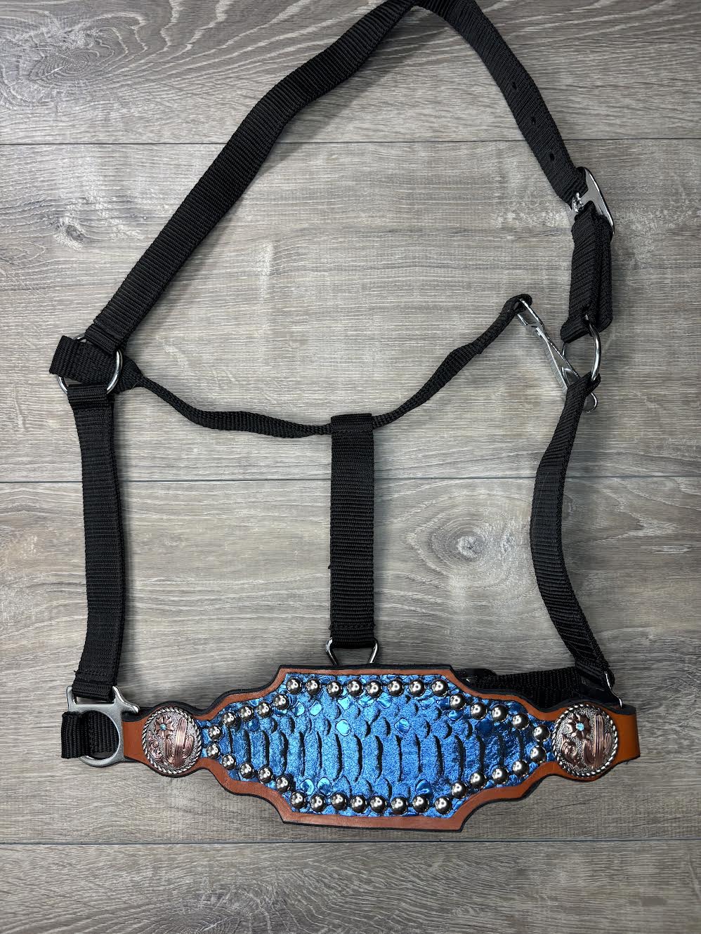 Leather bronc halter covered in shiny blue snake leather, silver spots and silver conchos with copper cactus design. Your purchase includes a black nylon halter that you can easily change out with two phillips head screws.
