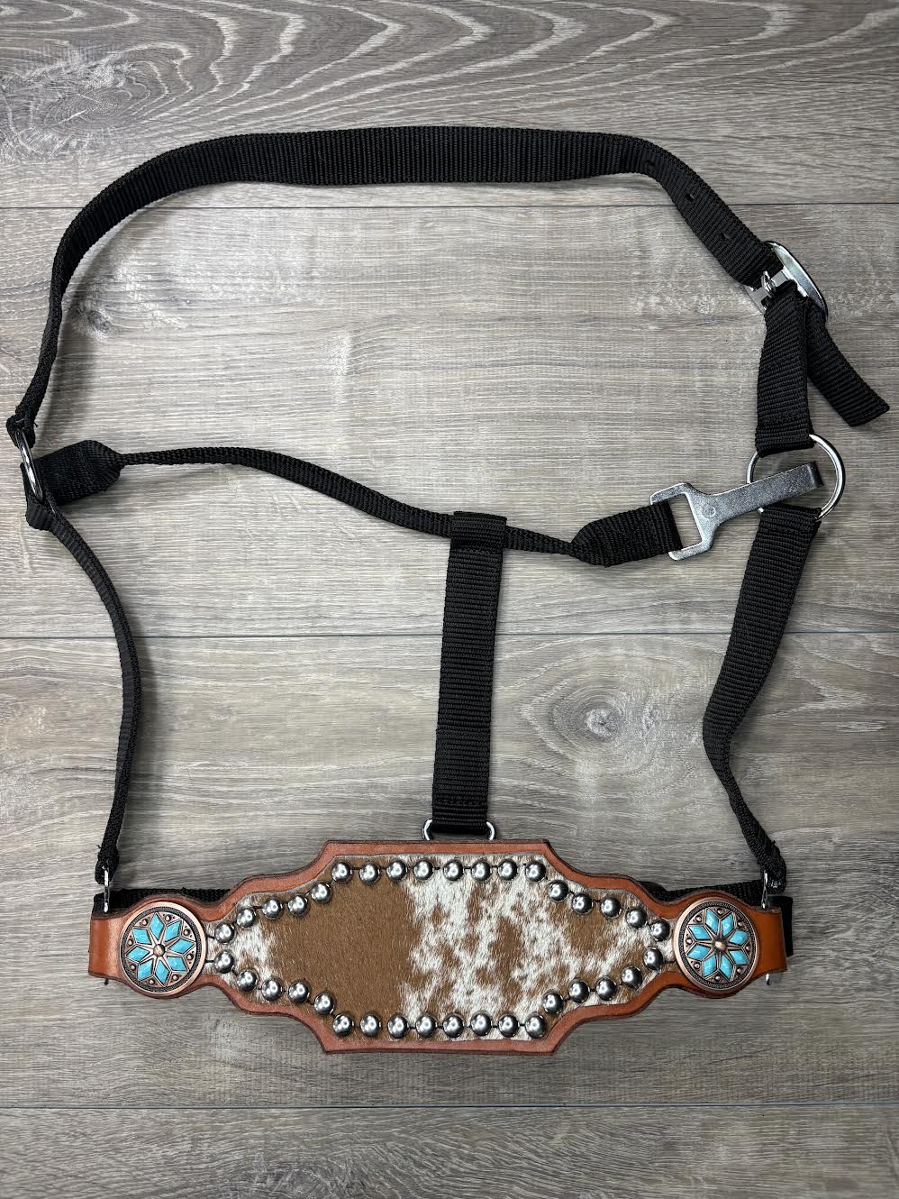 Premier brown/white cowhide bronc halter with turquoise conchos