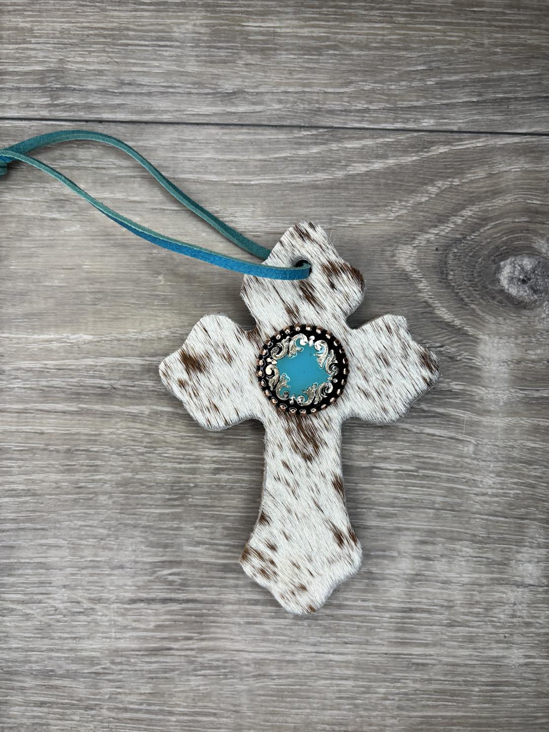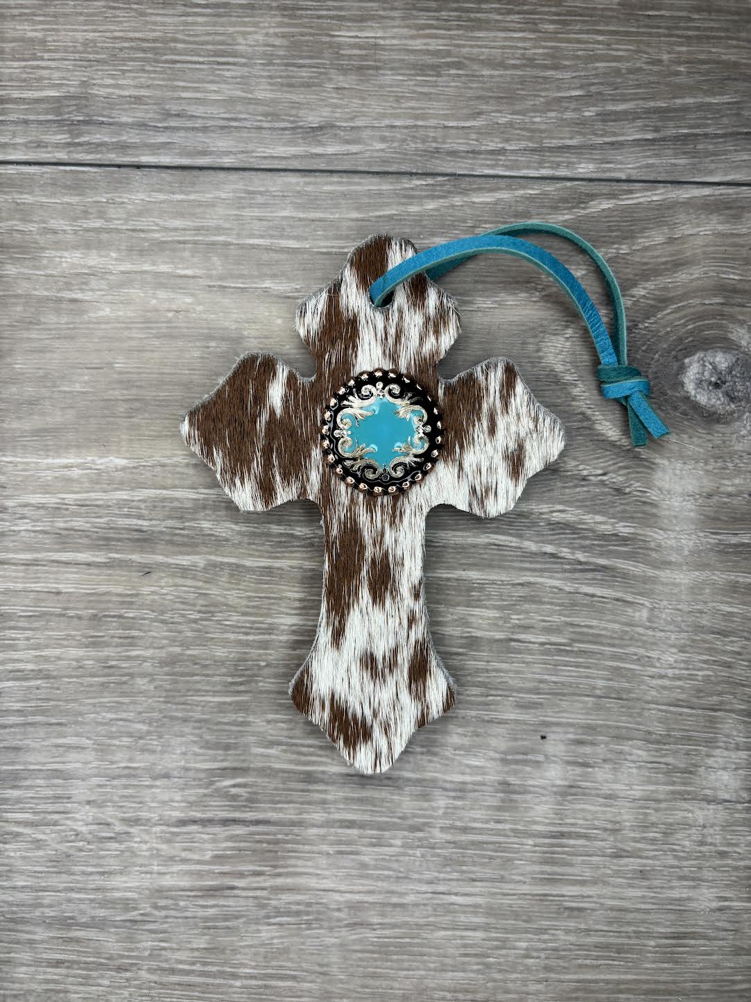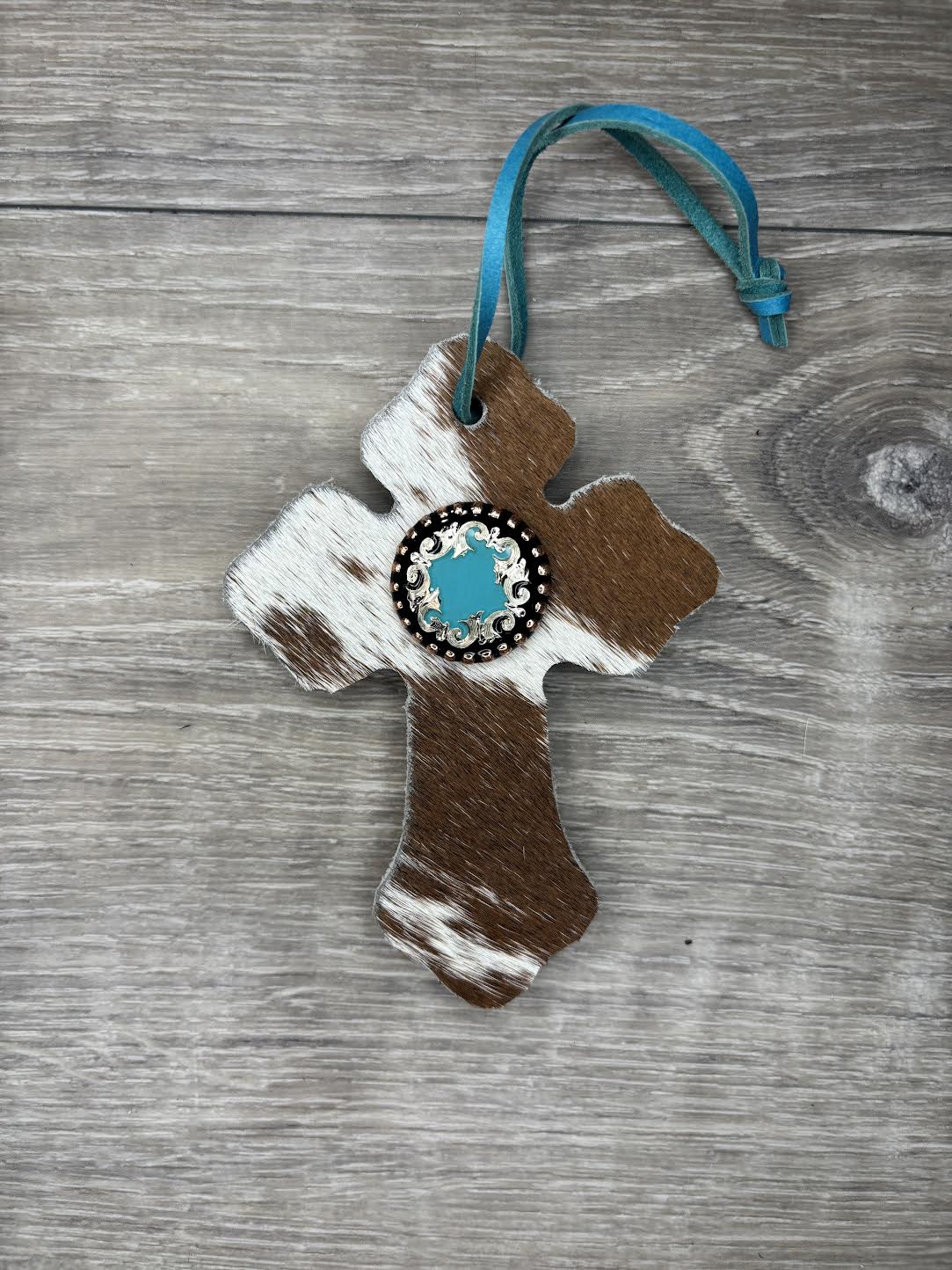 Saddle Cross covered with brown and white hide. Decorated with a turquoise, silver, and black concho. Hide design may vary. 4.5" X 3.25"