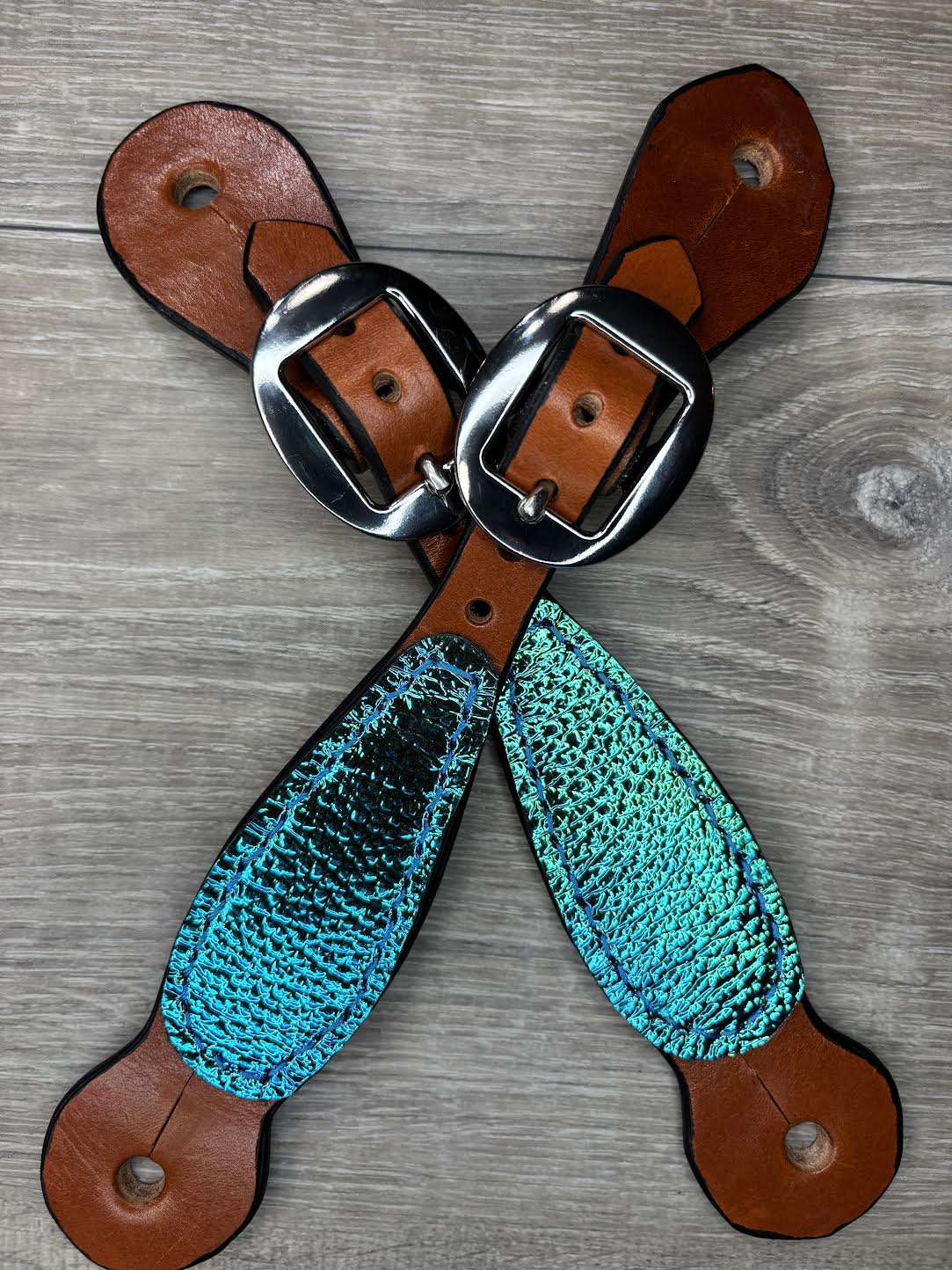Set of woman's spur straps with blue/purple/green transition leather attached.